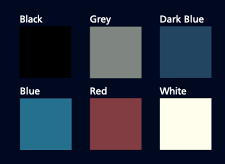 Črna, siva, temno modra, modra, rdeča in bela